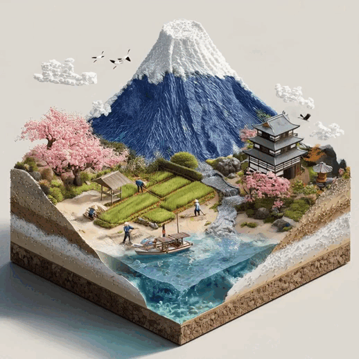 Hyper-realistic isometric view of snow-covered Mount Fuji, framed by cherry blossoms and traditional Japanese houses.
