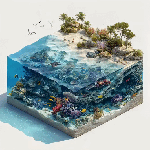 Hyper-realistic isometric fragment of the Great Barrier Reef in Australia, with colorful corals, sea turtles, tropical fish and turquoise waters.