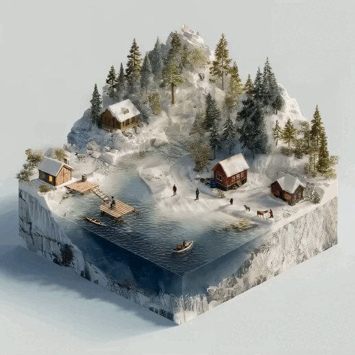 Hyper-realistic isometric view of the Norwegian fjords, with snowy mountains, deep waters, and colorful houses by the shore.