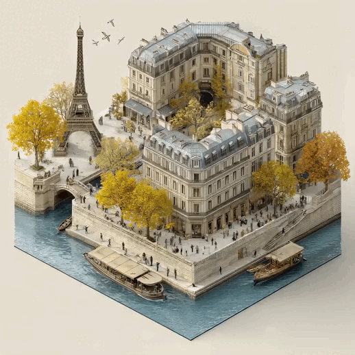 Hyper-realistic isometric view of the Eiffel Tower and Champs-Élysées bathed in golden sunset light. Strollers and cafés bring life to this romantic fragment of the City of Light.