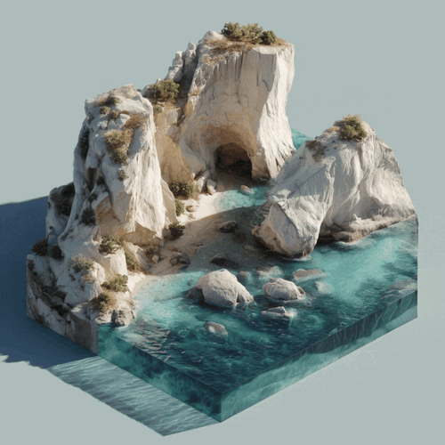 A floating fragment capturing the essence of Cyprus, featuring the iconic white cliffs of Petra tou Romiou (Aphrodite’s Rock), surrounded by turquoise waters and enriched with subtle references to its ancient Greek and Byzantine heritage. A microcosm embodying the myth and nature of this Mediterranean island.
